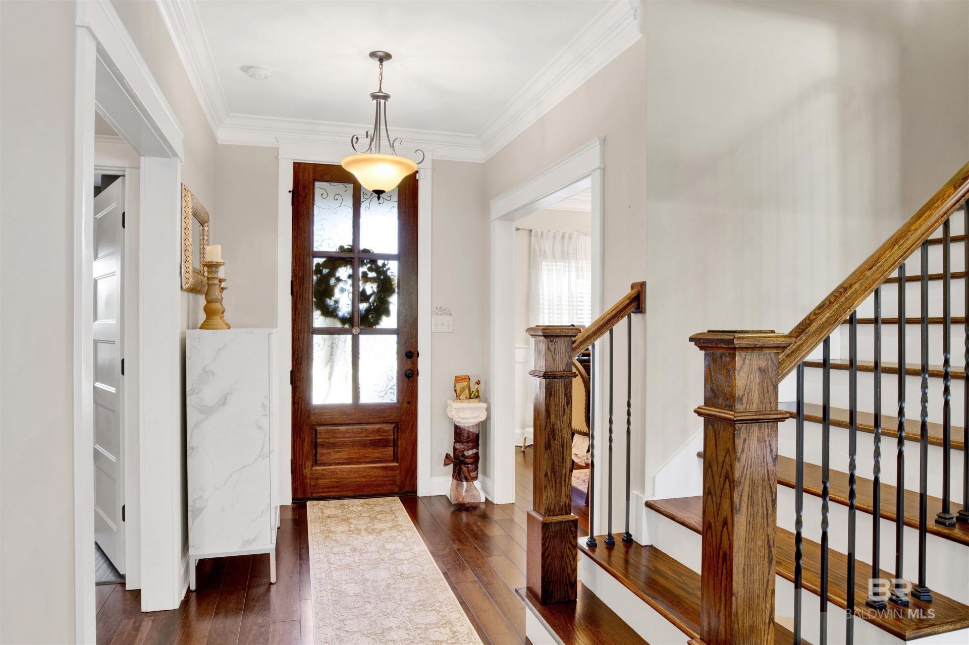 Nestled among a beautiful, mature landscape, this exceptional home exudes warmth and elegance at every turn. Step inside to discover wood flooring throughout living spaces. Wainscoting in dining room. The oversized great room becomes a true centerpiece of this home with its tray ceiling, recessed lighting, and striking two-sided fireplace. Kitchen is a dream for cooking enthusiasts, massive L-shaped island, Bosch appliances including a new Bosch gas range, stainless steel appliances, tile backsplash, kitchen desk/coffee nook, and solid wood raised panel cabinetry. Plus a charming banquette for casual dining. Mudroom offers added convenience, and the flexible office space on the first floor can easily serve as a fifth bedroom. Primary suite showcases wood floors, tray ceiling, recessed lighting and an ensuite bath with a separate tub and shower, dual vanities, and two walk-in closets. Additional bedrooms are equally impressive?large in scale with ample walk-in closets. Floor to Ceiling windows allow natural light inside while enjoying views of the oversized, fenced backyard. Throughout the home, you'll find solid wood tread stairs, loads of storage, and a relaxing screened porch perfect for unwinding. The side-facing garage rounds out the property's impeccable design, combining functionality with charm. Convenient to Shopping, I-10 and schools. Buyer to verify all information during due diligence.