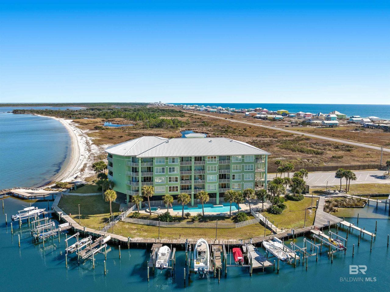 Enjoy true waterfront living at Navy Cove Harbor, a gated community designed with boaters and beach lovers in mind. Residents have access to community amenities including a pool, hot tub, gazebo, BBQ area, boat launch, fishing pier, and a convenient fish cleaning station. For boating and fishing enthusiasts, Unit 1209 includes deeded boat slip #1 with a lift, ideally positioned next to the fish cleaning station for easy days on the water. Located just 0.4 miles from the Fort Morgan public beach and less than 10 minutes from Fort Morgan State Historic Site, this east-facing condo offers stunning views of both Mobile Bay and the Gulf while keeping you close to outdoor adventure and historic charm. Sold fully furnished, this unit offers 3 bedrooms, 2 bathrooms, and approximately 1,260 square feet of living space. Tile flooring runs throughout for easy maintenance, and the open living and dining area flows seamlessly onto a private balcony with tile flooring, where you can enjoy morning sunrises over the water. The kitchen features granite countertops and a bar with seating, creating an inviting space for gathering. The primary bedroom captures beautiful eastern views and includes an ensuite bathroom with a double vanity, jetted tub, and separate shower. Two additional bedrooms share a full bathroom, and a stacking washer and dryer is conveniently located in the unit. With rental projections up to $33,000 annually, this property offers both an exceptional coastal retreat and additional income potential. Buyer to verify all information during due diligence.